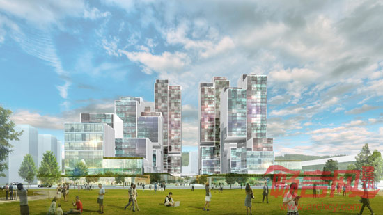 最终,呈现出裙楼和塔楼之间高低错落有致的格局。建筑群包括七座办公楼,最高处位于地块北面,南面为最低,临近河边。另有一座两层裙楼,由16.5×16.5m和8.25×8.25m的方块体构成,用于商业和办公用途。