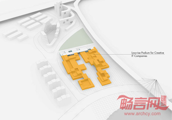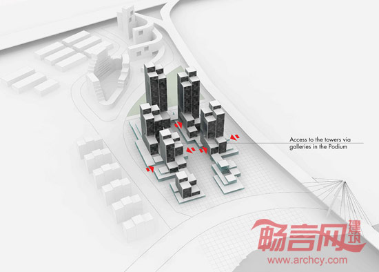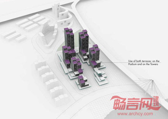 遵从设计过程中的关键指南和周围环境,例如,地块东面的高速公路(路宽达几米且高于地面层),同时考虑到地块南北相连的重要性,设计方案采用网格打造了一处“方形平台”。南面的河流和北面已有的绿化区凸显出南北连接的重要性。所有元素糅合在一起构成了项目的设计基调:露天平台风景。露台的处理别具匠心,无论是面向河流或是朝向IT产业园内,每座塔楼均可拥有至少一面开阔的景致,并享有最佳的视野。露台亦可用作室外活动场所,比如产品展示,会议或休闲小憩。