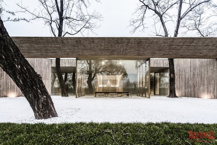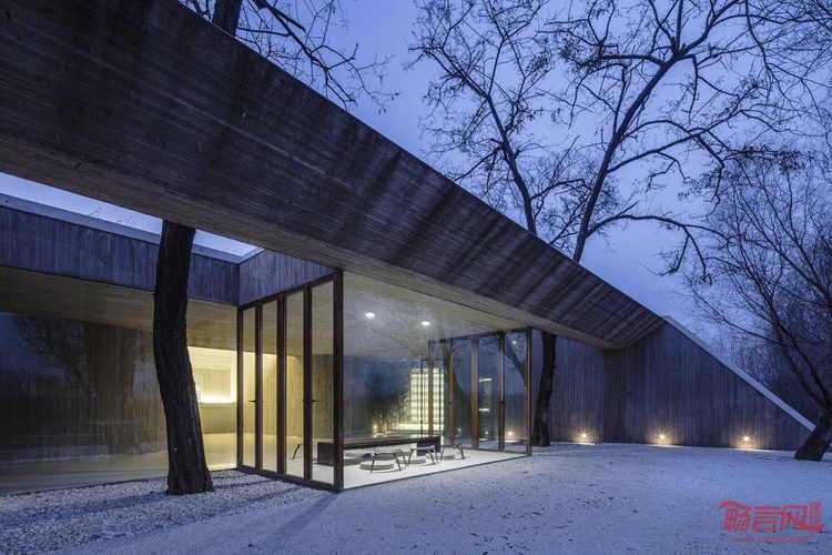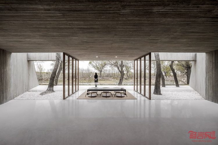 为了将河畔树木完好的保留下来,建筑平面小心翼翼的避开所有的树干位置,它的形状也像分叉的树枝一样伸展在原有树林之下。依靠南北与沿河面的两条轴线,建筑内部产生出五个分隔而又连续一体的空间。五个“分叉”代表了出入、参佛、饮茶、起居、卫浴五种不同的空间,共同构成漫步式的行为体验。建筑始终与树和自然景观保持着亲密关系。出入口正对着两棵树,人从树下经由一条狭窄的通道缓缓的走入建筑之内。