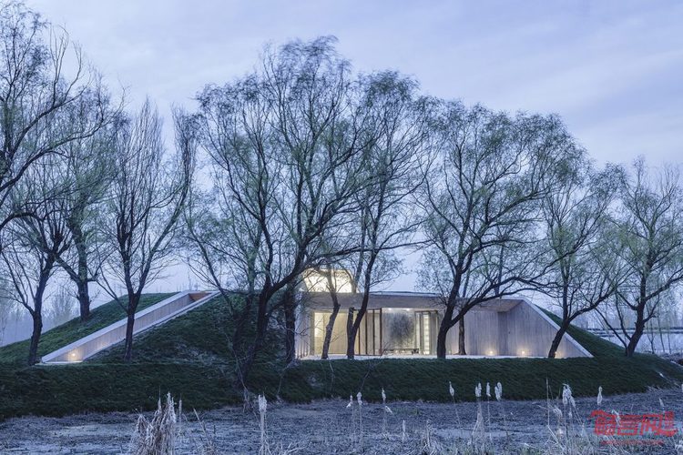 这是一个供人参佛、静思、冥想的场所,同时也可以满足个人的生活起居。建筑的选址在一条河畔的树林下。这里沿着河面有一块土丘,背后是广阔的田野和零星的蔬菜大棚。设计从建筑与自然的关联入手,利用覆土的方式让建筑隐于土丘之下并以流动的内部空间彰显出自然的神性气质,塑造树、水、佛、人共存的具有感受力的场所。