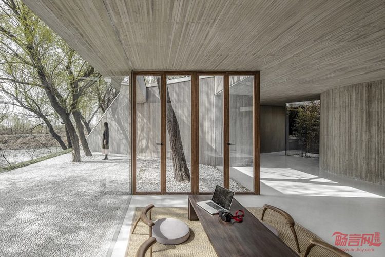 与自然的关系进一步延伸至材料层面。建筑墙面与屋顶采用混凝土整体浇筑,一次成型。混凝土模板由3公分宽的松木条拼合而成,自然的木纹与竖向的线性肌理被刻印在室内界面,让冰冷的混凝土材料产生柔和、温暖的感受。固定家具也是由木条板定制的,灰色的木质纹理与混凝土墙产生一些微差。室内地面采用光滑的水磨石材,表面有细细的石子纹路,将外界的自然景色映射进室内。室外地面则由白色鹅卵石浆砌而成,内与外产生触感的变化。所有门窗均为实木门窗,以体现自然的材料质感。禅宗讲究顺应自然,并成为自然的一部分。这同样也是这个空间设计的追求——利用空间、结构、材料激发身体的感知,人与建筑都能在一个平常的乡村风景之中重新发现自然的魅力,与自然共生。