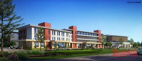 小学的总平面设计,在学校入口处留出200平米的学生集散场地,同时在学校入口处沿珠江路围墙局部退后6米,预留出家长的停车位,大大减少了学生上下学时段,学生及接送学生的家长形成的集中人流及接送孩子的车辆出入对城市道路珠江路的交通压力,同时也突出了小学的入口,形成尺度宜人的学校入口空间。小学的各个功能部分采用 “风车”形式的布局,将学校的普通教室教学区、实验教室教学区 、行政办公区 、图书阅览及阶梯教室区分别放置在“风车” 的四个翅膀上,任务书要求的26个普通班级分别设在西北和东南方向的两个翅膀上,这样既减少了建筑的尺度,也避免产生大量集中地人流。行政办公区和图书阅及览阶梯教室区分别设置在“风车”东北方向和西南方向的两个翅膀上,“风车”的四个翅膀通过南北方向稍偏南北倾斜的连廊联系起来,使得四个功能区在相对独立中又相互有联系,连廊的东西两侧布置实验教室。“风车”西北方向的翅膀作为一普通班级教学区,设置13个班级,该教学区正对学校入口广场,突出教学区在学校的主体地位,也营造稳重严肃的教学氛围。在“风车状”建筑的西侧布置一栋综合功能的单体,将食堂、风雨操场及学生宿舍组合在一栋建筑单体内,这样比较节约用地,又能形成一个整洁大气的建筑外观形象。在食堂和风雨操场综合楼的西侧布置三个篮球场地和一个三百米跑道田径运动场,形成一个较为完整的运动区域。