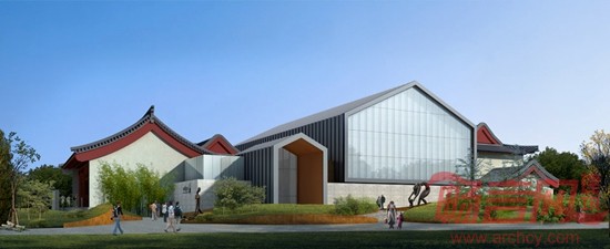 该项目位于北京市通州区梨园文化公园内,公园建成几年,植被良好。园内有一对两层仿古建筑——戏楼与茶楼,新的韩美林艺术馆正是要建在这一对仿古建筑之间。北侧为韩美林艺术馆一期,南侧为湖面,沿公园东北一侧是城市高架轻轨,并设有车站。