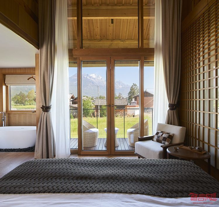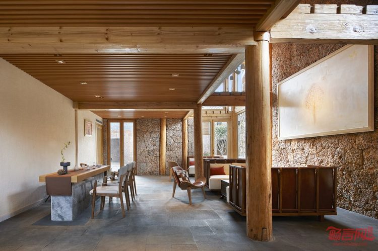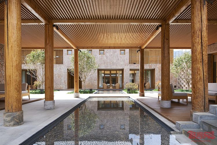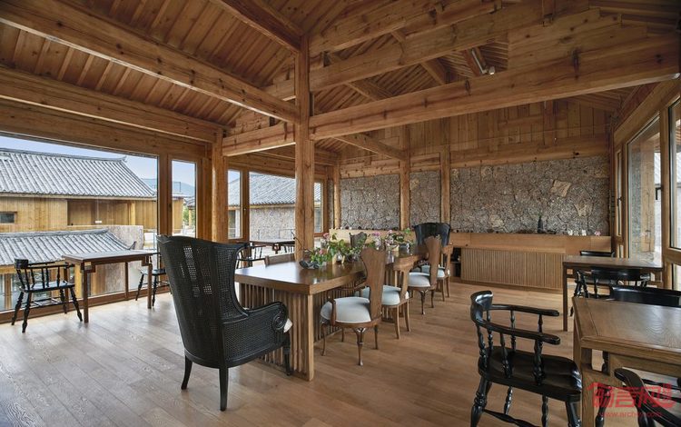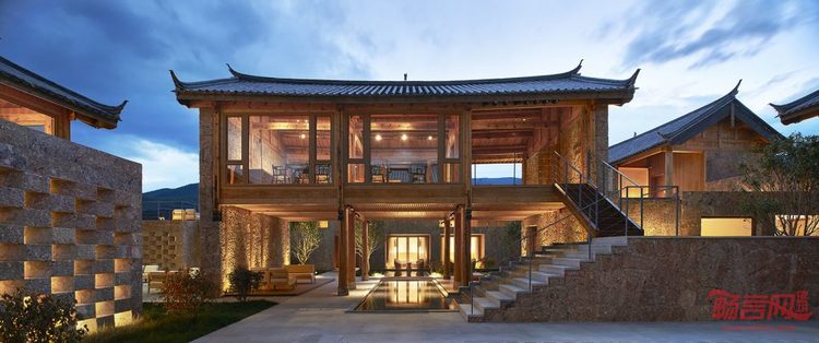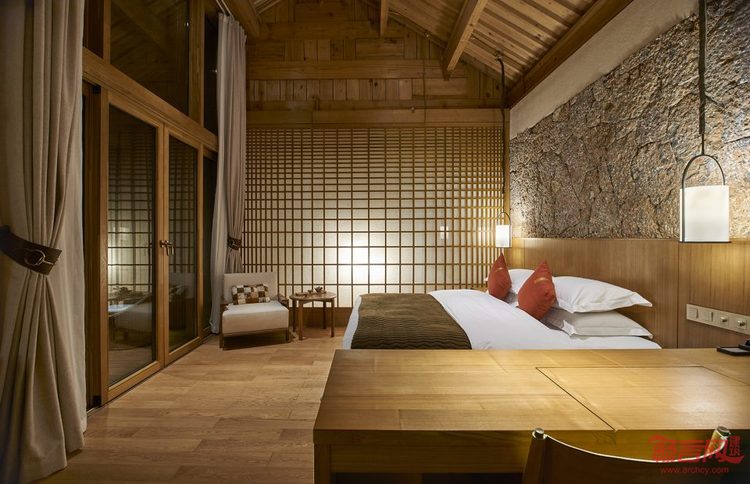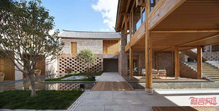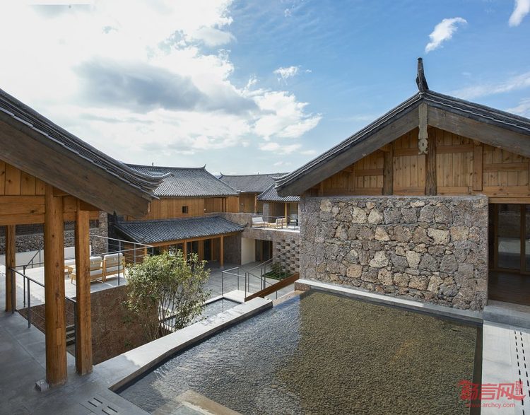 外墙部分的五花石的堆积方式也是经过深思熟虑,平面特意采用梯形,尽量避免在立面上出现大面积石层,营造出一种浮游感,同时也凸显石块本身的厚重存在感。客房以及走廊下方为吸引视线而设的光墙,则利用当地产东巴纸,设计成有渐变效果的格子光墙来有效控制光线。