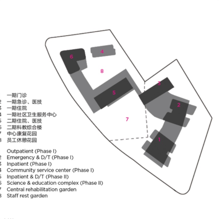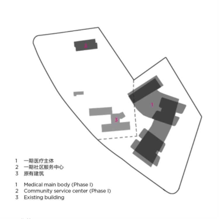 在高速发展的苏州高新区,医疗资源的需求也极其巨大。本项目处于高新区一个计划分步更新与扩张的医院老院区。结合城市规划,整合周边一片狭小而不规则的地块,建设分步更新的一期工程。