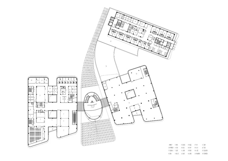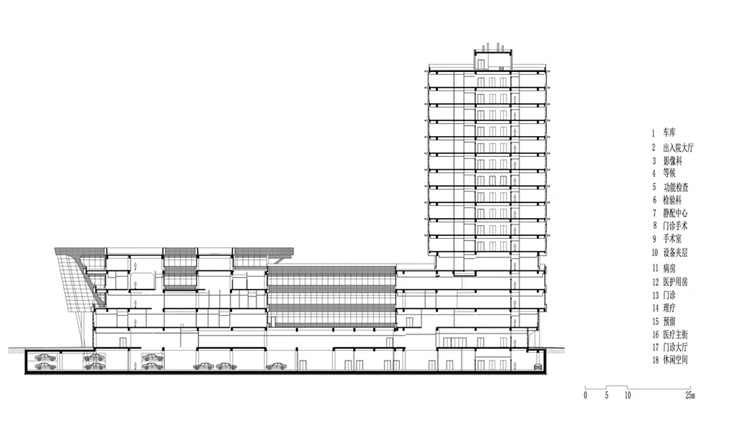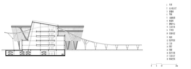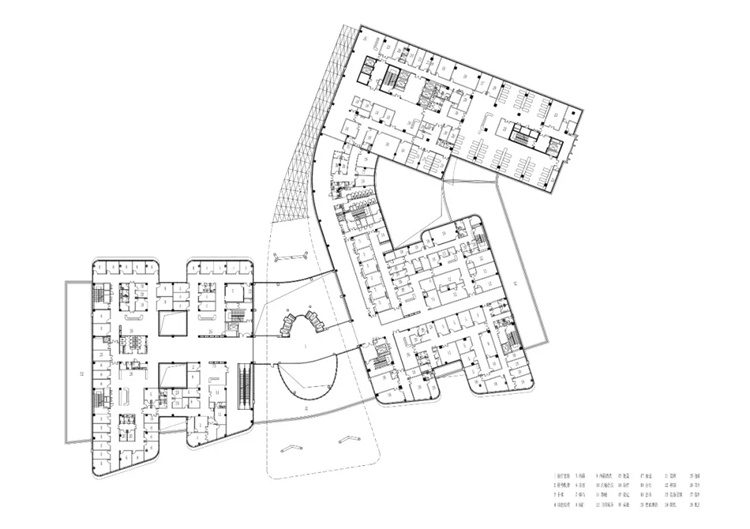 主体大楼以弧线和直线组合的形式与用地完美契合。门诊部位于场地最南端,面对地块主要开口方向,便于人流车流的进出集散。急诊部位于医技部东侧的底层,而医技部的位置居于门诊部和住院部之间,方便两部分的患者进行医学检查和治疗。