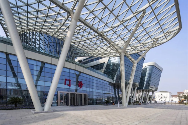 共享大厅是整个建筑立面的视觉焦点,使建筑形象更加立体饱满;穿插于建筑形体之中的曲线雨篷、顶层建筑体量的收分,使整个建筑的曲线感更加灵动、畅快。共享大厅位于建筑沿街面的中心位置,各医疗功能通过主街和共享大厅串联布置又自成盲端,连接门诊、医技与住院部,最大程度上缩短了医疗流程,形成医院的枢纽交通。