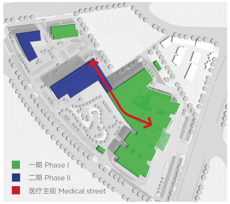 结合一、二期功能规划,整合规划院区医疗流程。由于地形的不规则,该项目打破常规医院设计中传统的“门诊-医技-病房”三段式格局,以一条“医疗街”贯通全部医疗功能,联系门诊、医技、病房。医疗街始于门诊大厅,往北延伸联系急诊、医技与住院部,也将连通未来的二期工程。
