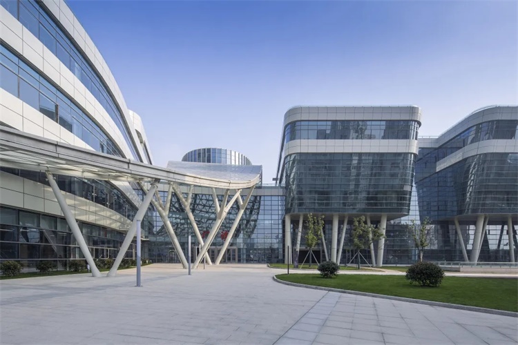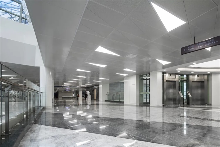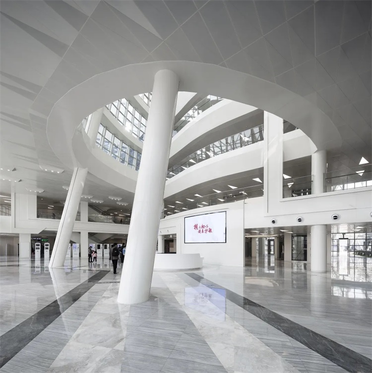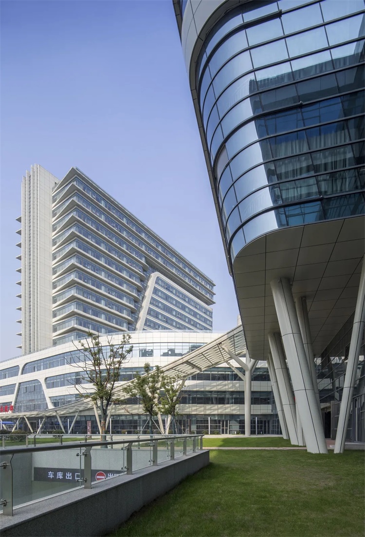 该项目对幕墙进行墙身系统策划,在满足节能要求的同时,适当提高外墙热惰性指标,并提高外维护系统的隔热性能,改善室内环境。内装修设计呼应建筑体形的灵动,医疗主街大厅等公共空间天花设计采用三角形铝板,与建筑空间曲线有机结合,地面铺装线条与标识相结合,使公共空间更具有导向性。此外,不同功能区域采用差异化装修,体现功能特色。