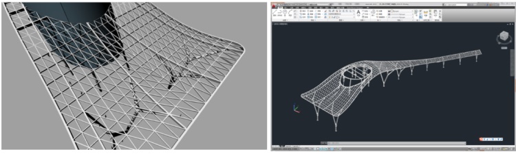 本项目造型上的突出亮点之一,就是从门诊入口广场延伸至住院部入口广场的钢结构飘蓬。该飘蓬是三维曲面造型,采用树状分叉钢柱支撑。不同于普通规整的形体,如果采用常规施工图表达方式:平面、立面、剖面,将带来极大困难。在设计过程中,建筑、结构一体化设计,建筑专业通过“Rhino”软件精确三维空间定位,将整个飘蓬简化为三维立体模型,精准、快速地提交给结构专业,结构专业的受力反馈也在三维空间模型中完成调整,最终快速精准地完成异形复杂形体的施工图设计。