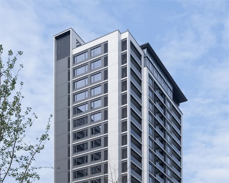 在点式住宅的南立面,通过户型的错动,建立建筑体量的进退关系,通过线条和材料颜色的变化将这种关系加以强化,建立起一种竖向的秩序感。屋顶玻璃体结合屋面铝合金的飘板在重塑第五立面的同时,明确建筑体块的穿插关系。