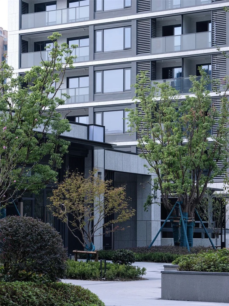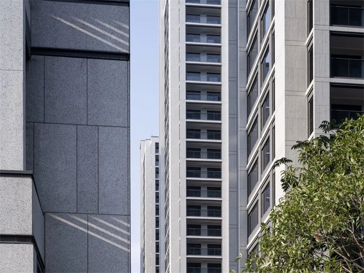 住宅造型上并不拘泥于传统住宅追求的对称美学和经典的三段式,以公建思维处理建筑体量间的关系。
