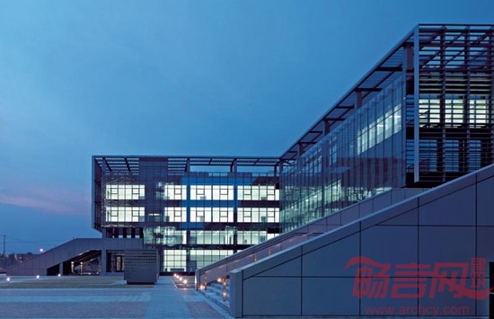 一体化的设计使主楼与裙楼的主从关系消解,且更适合功能需求。主楼与裙楼的立面表皮连贯,一气呵成。设计力图弱化主楼和裙楼的形态差异,主楼适应于较为内向型的办公空间,裙楼则更适应于外向型或内部联系更为频繁的部门。