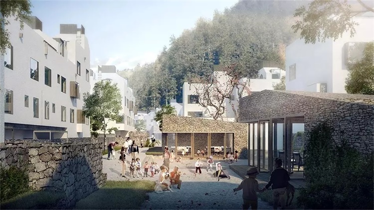 此外,社区里的多个大院之间也建立了有机的联系,一条主路串联了整个地块,在道路的节点处,散落布置了户外中心、教堂等公共建筑。当人群游玩归来,沿街可见到每一个热闹的场景,并可随时参与进当中,创造度假的多种可能性。