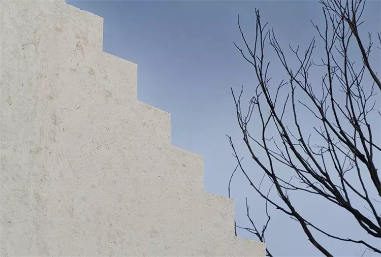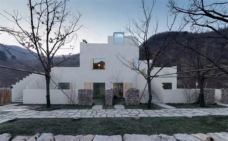 北方的四季泾渭分明,建筑外观色彩与场地形成天然的反差,纯色的建筑群在热河山谷变幻的四季中皆能跳脱于前。然而建筑的一部分还是融入自然的,就地取材的采用毛石、木头、掺着稻草杆的手工土壤等原始的材料,像是对自然原始状态的现实模拟。