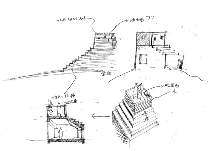 同时,长城烽火台的形象概念化的嫁接于建筑屋顶设计中,屋顶阶梯的元素借以回应长城的痕迹,自然而然的产生历史的厚重深意与度假的轻松惬意的对比。