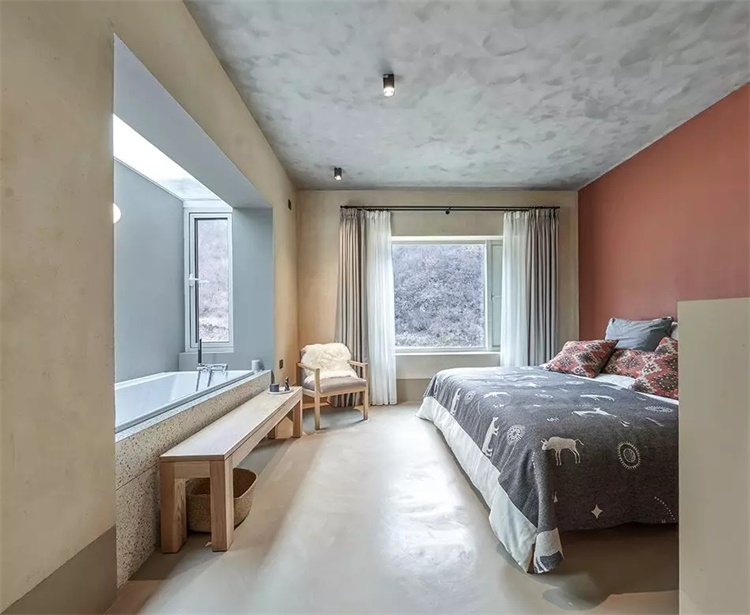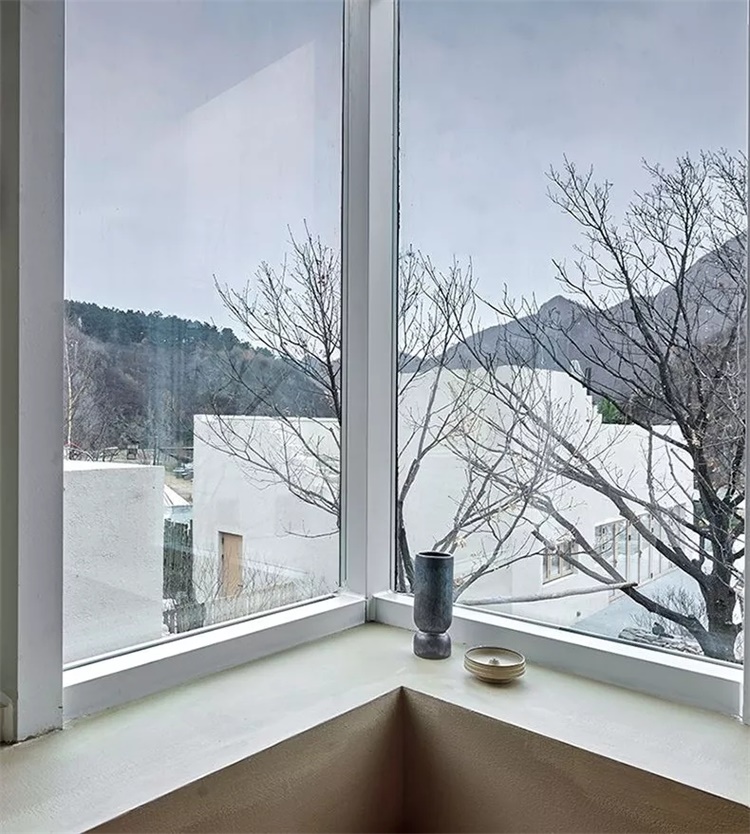另一种有趣的冲突则是窗洞设计,在符合室内功能的前提下,它并不考究严格的比例关系,自由随机,让人放松。窗户采用幕墙的处理工艺,形成墙窗齐平的效果,通透玻璃与粗粝墙体形成反差。转角处开窗的运用,减轻建筑厚重感的同时,让人们可于窗前纵观热河山谷自然景观。