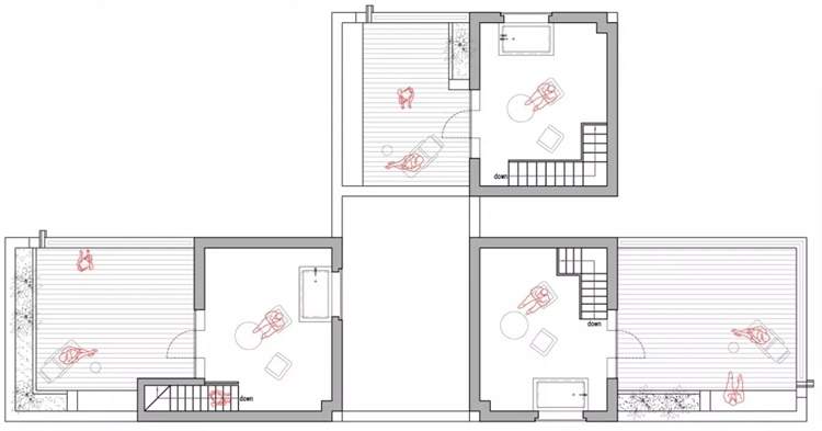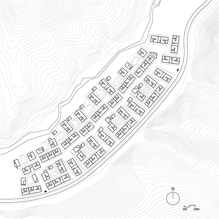 当抵达热河山谷,每户人家需由户外庭院或者露台进入室内。拾级而上时,经过别家院落,自然的会打个招呼,这成为关于度假社交的温和开端。在弱化度假的距离感之外,设计中并没有放弃居住的隐私性,靠近室内的院墙逐渐抬高,以庇护人们居住中所必需的安全感。