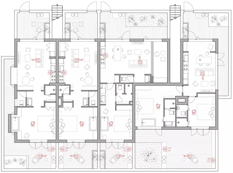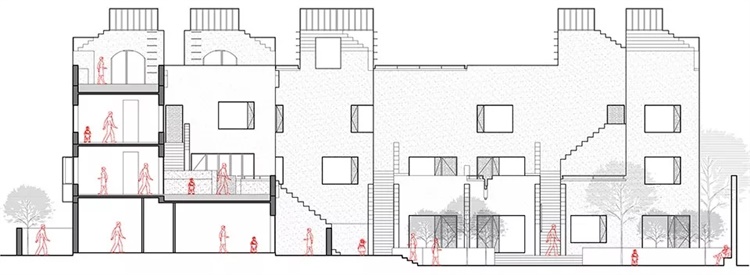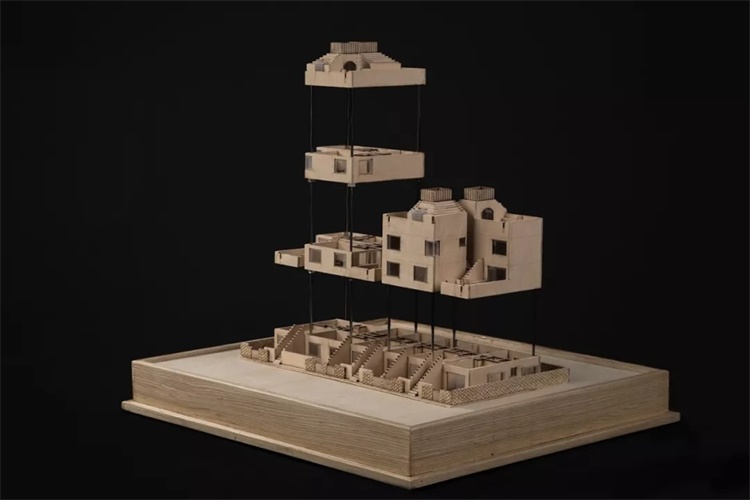 设计中将社交属性渗透其中,围绕“一户一院”的愿景,50平方米与75平方米的住宅单元依模数演变出4种建筑模块,4种模块相互堆叠,形成三层建筑形态,创造出丰富有趣的空间层次,如现实中的纪念碑谷。