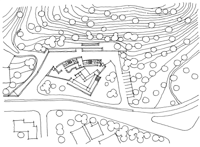 尽管第一印象颇令人费解,但经仔细读图和分析,发现这个设计还是有理可循的。首先看场地策略。在比较局促的梯形用地上,建筑师开辟了一条 C 形路,将建筑体量在地面上一分为二 :主体体量(展馆)独立,附属体量(设备用房)结合挡土墙,和后面的山体融为一体。观众入口、货物入口、贵宾入口,以及设备入口全部都开设在这条 C 形路上。此举不但解决了场地内车流循环的问题,也提供了一条环绕式消防通道,同时还解决了多个入口在立面上并置的构图难题,可谓一举多得。