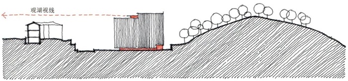 再次看流线组织。作为展览建筑,最重要的就是展陈空间和观展流线的设计。展厅外墙不开窗,可以让展墙面积最大化,也有利于让观众心无旁骛地观展,不被外部信息干扰。中庭充当了连续观展过程中的情绪调节器,坡道上的人互为景观对象,行进中可以体验“人看人”的游戏。中庭里两条悬垂的光柱,提示观众“更上一层楼”。中庭侧墙不开窗的做法虽有悖常理,却可产生某种心理效应 :观众越看不到外面,想看到外面的愿望就会越强烈,就像憋在水中的人渴望冒出水面一样,这种积蓄的愿望最终在屋顶平台上得到释放,也只有到了这个高度,才能真正看到远处的湖景。