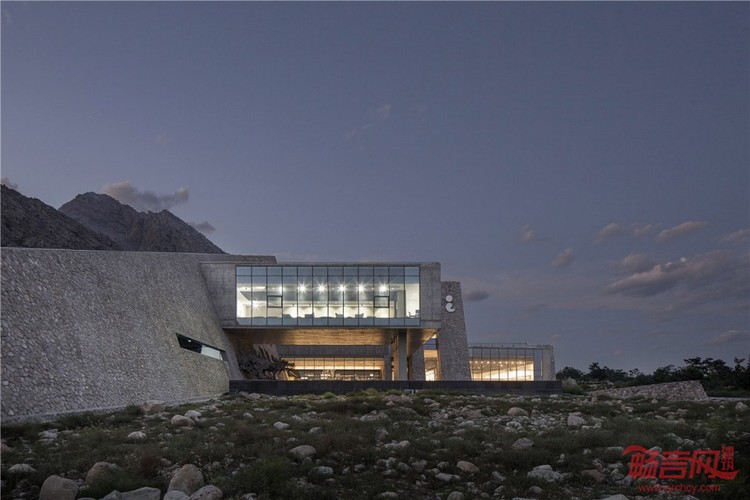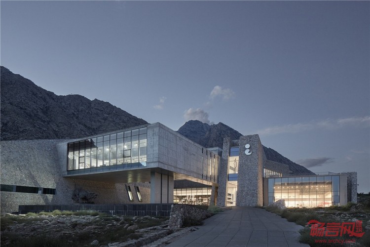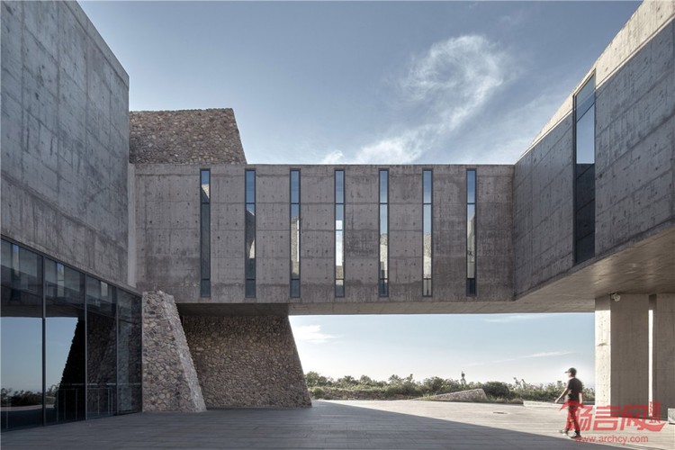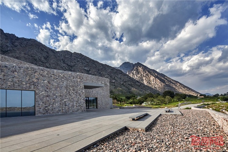为确保苍茫雄浑的场所特征,我们利用山势高差,将建筑整体嵌入山体。具有当地原始肌理的砌石墙体宛如自然天成,墙体间的“缝隙”承载建筑的主要功能。以清水混凝土构建的三个平台,仿佛搁置于原始地貌之上,营造出苍野大地间的安全领域感。