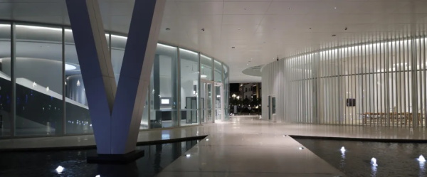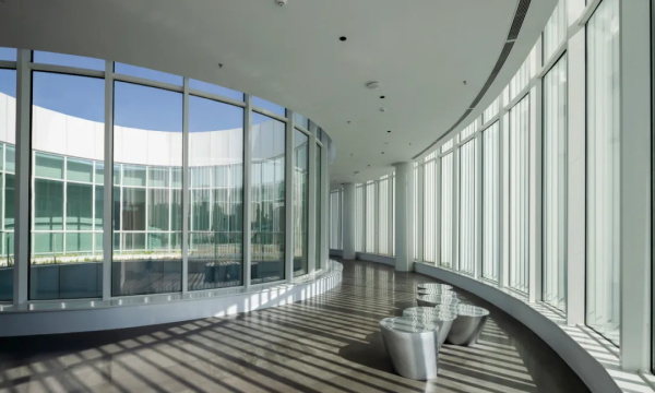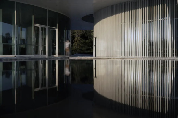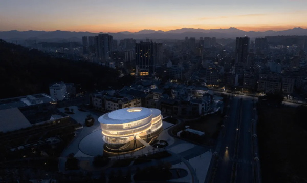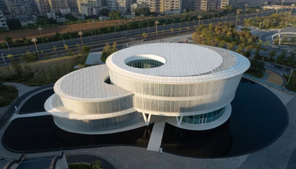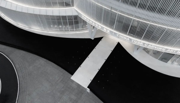 从城市广场远望,艺术馆呈现出一种椭圆与圆弧交织的形态。它不像传统博物馆那样以直线构成秩序,而更像一件经过不断打磨的器物:线条柔和、体量完整,仿佛一块被慢慢雕琢出的玉石。这种曲线并非单纯的形式表达。建筑内部的观展流线同样遵循旋转与环绕的逻辑。观众的路径像一条逐渐展开的雕刻刀痕,从入口缓缓进入建筑中心,再在展厅之间盘旋延展。空间因此成为一种连续的叙事,而非孤立的房间。