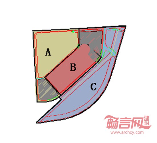 基地成扇形轮廓,共分三块用地。