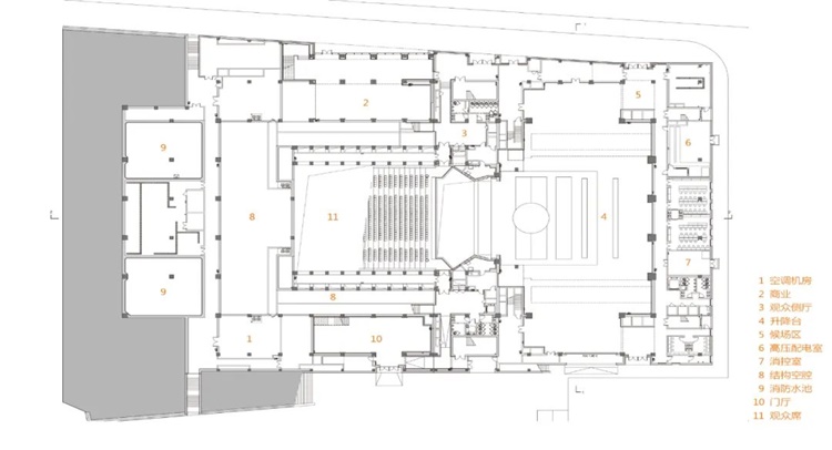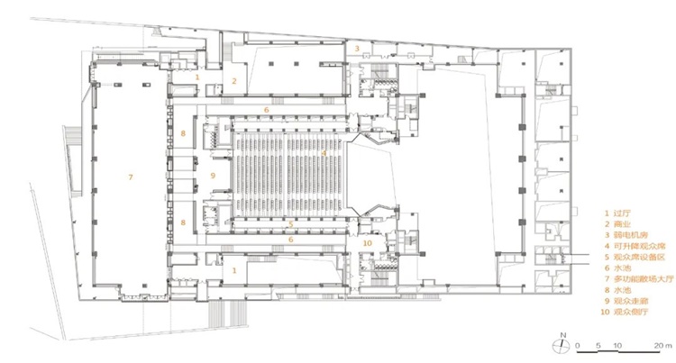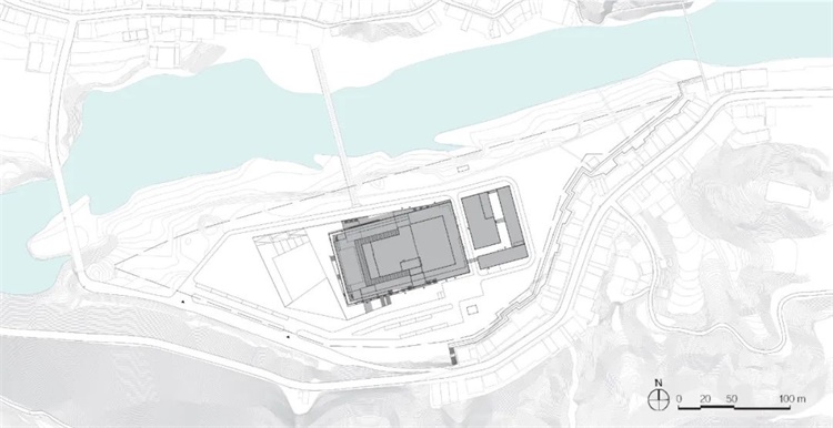 巴山大峡谷“梦回巴国”剧场约有800座,项目建设用地总面积为50000m²,总建筑面积为25218.5m²,其中包括剧场(面积为19481.4m²)、排练楼及宿舍(面积为5737m²)。建筑考虑到场地防洪的问题,将项目场地整体垫高3~5m。剧场主体建筑位于基地中西部,靠近基地的入口,建筑东侧分别设置了排练厅、宿舍楼;场地的出入口位于南侧规划路上,内、外流线划分合理。