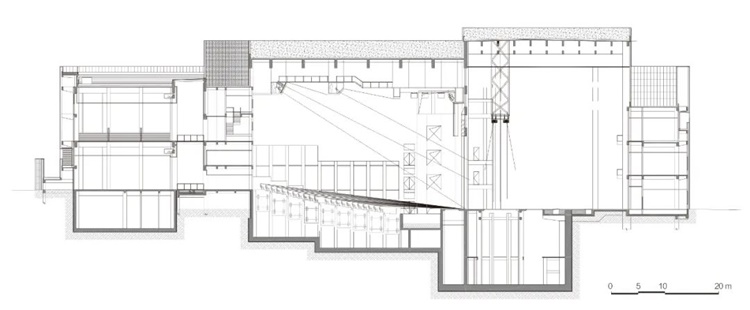 巴山大峡谷“梦回巴国”剧场结构设计的特点是与建筑景观、场地条件、建筑造型、建筑功能的充分结合。剧场立面以山、水为元素,呼应场地景观,通过结构大量斜向构件、悬挑、吊挂等方式,形成模拟岩石裂隙的建筑立面效果。为满足剧场内部观演功能的需求,设计在舞台及观众厅上空设置大跨预应力混凝土梁,实现观演建筑对大空间的需求。作为专属剧场,剧场内的舞台与戏剧是完全匹配、订制化的,结构设计通过设置局部夹层、局部下沉、顶部非标准马道、天桥、栅顶等方式,以满足设备、灯光、舞美及演员跑场等使用需求。