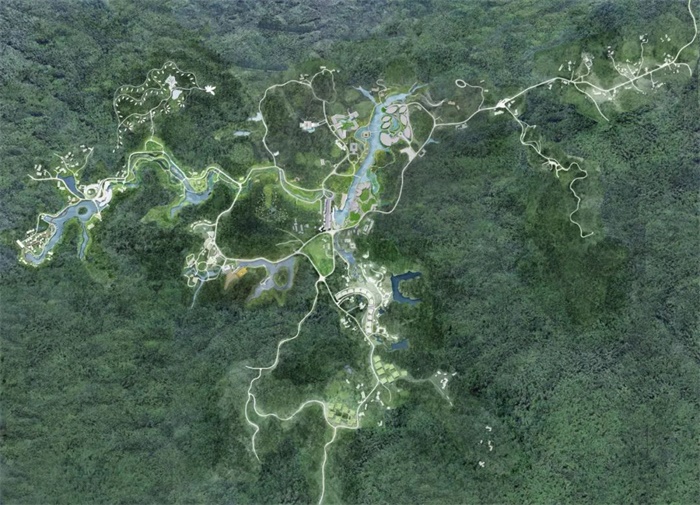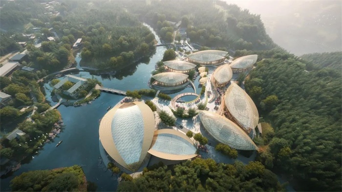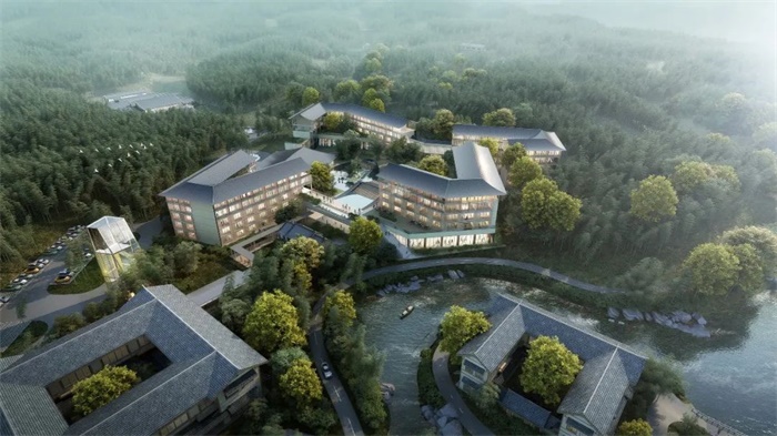 项目团队提出以竹为核心的新东方自然主义的设计理念,充分研究当地的山水骨架、植被群落、民俗村落肌理等自然风貌,修复、提升环境品质,激发场所价值,展现竹林丰茂、柔美的自然特征。以轻介入的方式,将丰富的活动空间嵌入自然元素中,建筑群体分合有致,与自然和谐共生,打造竹水交融的大地景观。