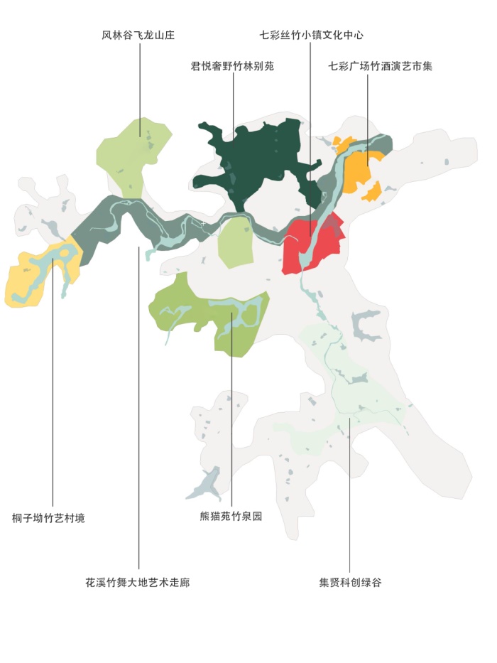 项目主要包括花溪竹舞大地艺术走廊、风林谷飞龙山庄、桐子坳竹艺村境、熊猫苑竹泉园、七彩丝竹小镇文化中心、七彩广场竹酒演艺市集、君悦奢野竹林别苑、集贤科创绿谷等八个部分。Cendes主要设计的是七彩广场竹酒演艺市集、君悦奢野竹林别苑和集贤科创绿谷三个部分。