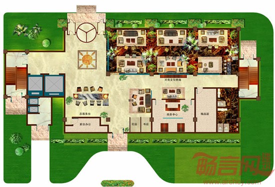 为增添绿色景致,在大堂吧做6~8棵热带树。树的标本是经过防虫和防腐处理的真树皮,经过再加工后做成与真树非常近似的假树,高矮不等,在夜晚树冠会发亮,起到灯的作用。在大堂东侧墙壁上做一些粗旷自然的石头,象征河南中原文化的古老,石与树、沧桑与鲜绿的对比,形成了室内简洁鲜明的环境设计理念。