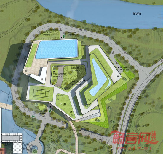 隐私,独立性和特权是设计中要阐述的概念。三层楼的高尔夫俱乐部项目中包括了普通会员区,就餐区以及第三层的私人独享区。在康体中心方面,我们有4层的娱乐,体育场馆功能和一个位于第五层的无边屋顶游泳池。这个无边游泳池体现了最高端价值,在畅游的同时,也观看到了整个场地的360度的全景画面。