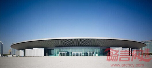 传统的会展建筑往往采用线性布局,具有模块化可持续发展的特征。而本项目由于受规模限制,只有5 万平米的建筑要求,且又要形成完整,统一的建筑造型,因此采用环形联通的平面布置方案。独特的布局达成了各展馆之间的无缝联接,相邻展馆可以灵活组合,既可以单馆使用,也可以将展馆任意并联。本项目如果内部空间全部开敞使用,则成为目前世界上面积最大的单体展馆。中心展馆的围合与开放、纯净与明亮,使空间的整体感得到升华,无形中塑造了展厅空间沉稳、宏大的精神特质。