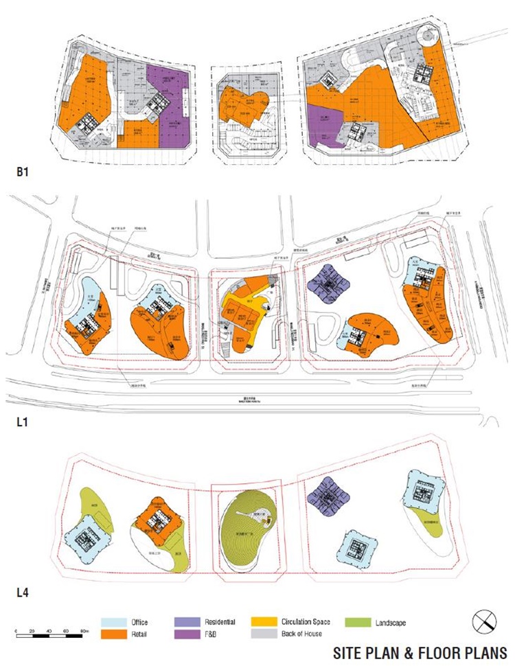 项目包含三个地块、四位业主、五种业态,挑战难度不小。设计将建筑按照2-1-3的数量依次从东至西排布,东侧为两座高层办公楼,中间地块为包含顶部城市公共绿色空间的商业会展大楼,西侧地块为两座高层办公塔楼和一座高层公寓。