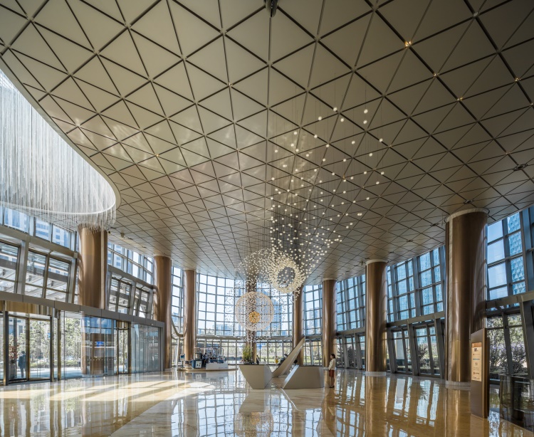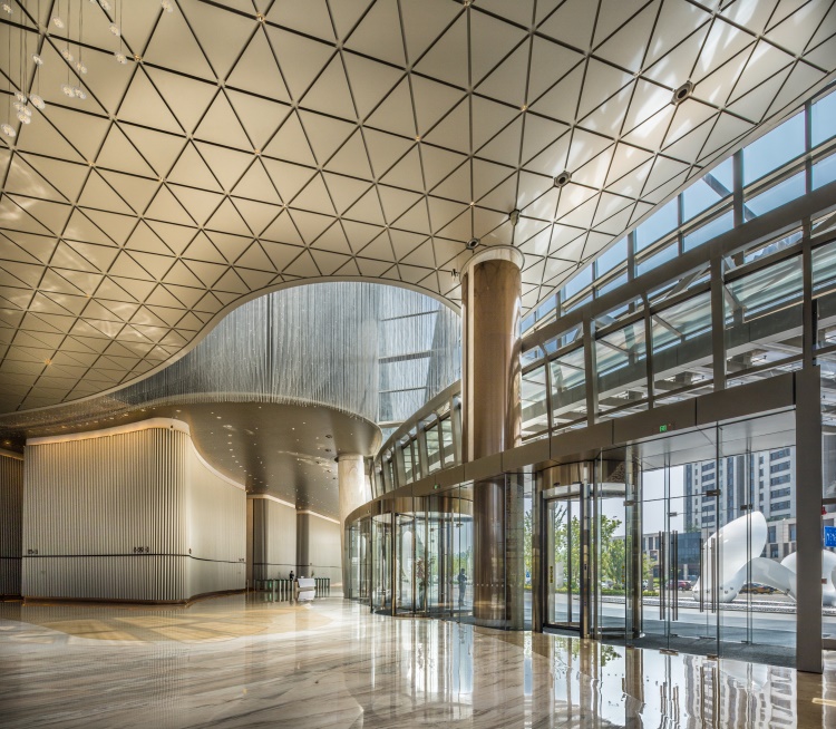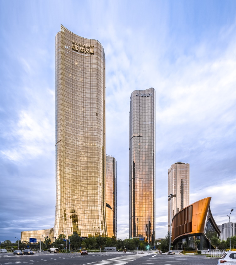 建筑轮廓则以竹与树为蓝本,以无限生机的寓意和独特的造型打造了望京乃至北京的新地标。塔楼设备及避难层以波浪形开口模拟竹节,增强了塔楼的连贯性和整体线条的美感,用玻璃幕墙演绎下的现代都市翠竹松柏。华灯初起,立面上办公室橙色的灯光透过蓝灰色的玻璃幕墙错落亮起,与竹节处鎏金般的灯光遥相呼应,营造出神秘典雅之感。