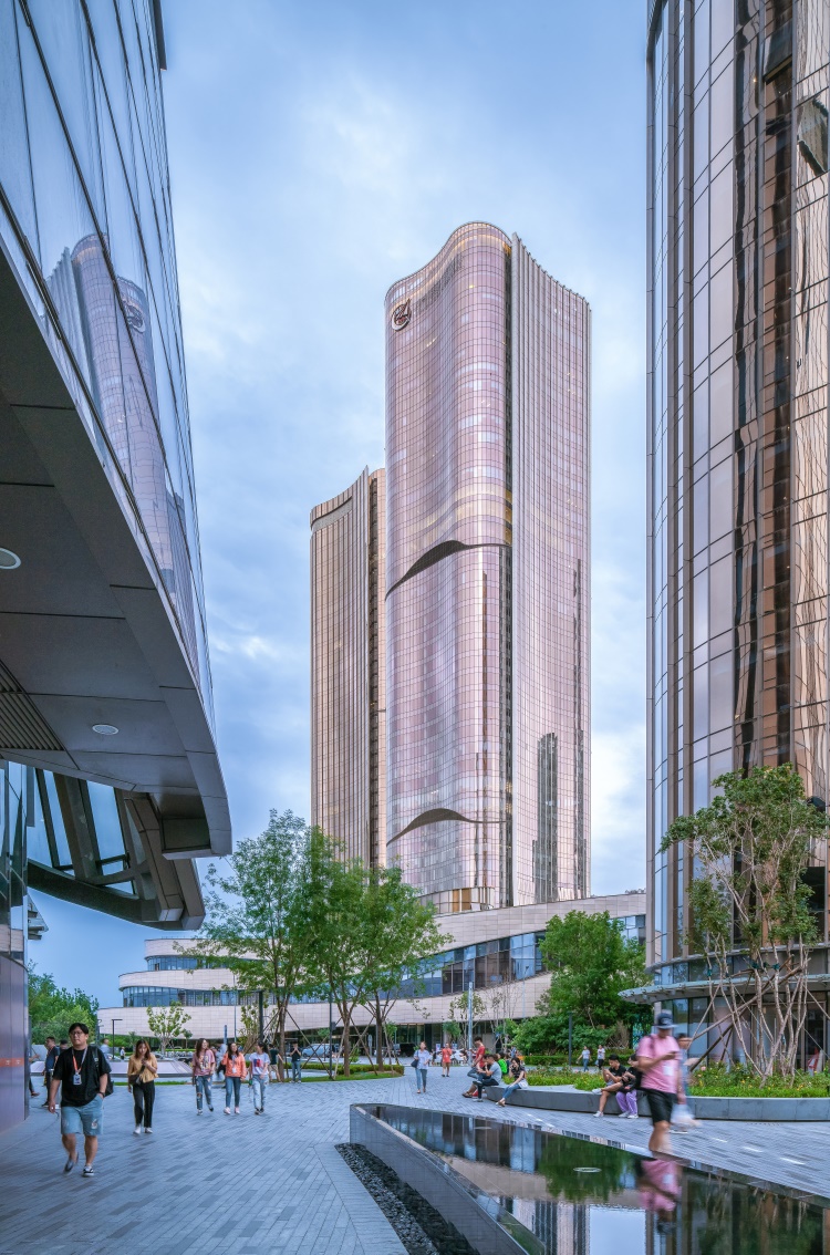 为了让建筑群尺度宜人,设计在建筑体量上极为用心。塔楼最初为方形体量,为了缓解地块面积紧张带来的塔楼间距过小,设计将方角改为圆角,并以内弯的立面模拟傲然挺立的修竹,既强化了塔楼的线条,又使有机立面更为硬朗。当步入楼群中,抬头仰视塔楼,仿佛置身于一片原始的茂林修竹之中,而玻璃有机幕墙在隐隐提醒这是现代都市。
