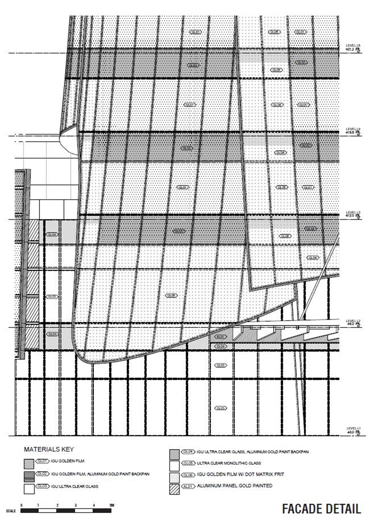 考虑到整体视觉效果,设计给楼层较少的塔楼增加了两边连续立面,以垂直的线条描绘树柏,增加了塔楼的修长感,塔楼与裙楼用模拟树干与树根的形态,模拟树根的曲线,为硬挺的立面增添了一份柔美。