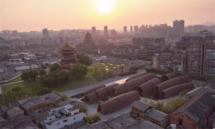 在博物馆设计中,朱锫以一种有机的方式回应了城市秩序和地段环境的要求。站在龙珠阁顶层俯视御窑博物馆,多个砖拱排成一种“横看成岭,侧看成峰”的山体类型,并以自由匍匐之势与周边的建筑相互融合。南北向摆放的拱顺应夏季主导风向,让风穿越建筑,建筑师在考量建筑布局的同时充分顾及了当地的气候条件。建筑用地周边的现存环境多元且异质——古塔龙珠阁、高层住宅楼、古代街巷、名人故居、众多私家民窑遗址等,纪念建筑与日常建筑共生共存。这种多元的异质的环境与自然产生共鸣,多样的异质空间给人带来了丰富的感官体验。