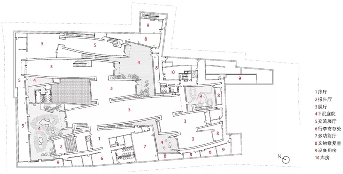 实际上,在御窑博物馆自由闲散的环境氛围中也体现出了空间的流线关系和主次关系。博物馆的固定展览空间借助于一个密闭的环路完成。两个临时展厅可以同时或分别并入环路,融入整体展览,也可独立存在,它们有自己独立的入口和出口。修复室与机械室布置于主要展厅周边,不仅方便使用,还可以将古瓷修复过程融入展览,成为展览空间的组成部分。由于临时展厅与修复室、机械室主要位于地下一层,且相互连接,朱锫建立了灵活紧凑的空间关联,避免了过度渗透可能导致的紊乱无序,在层次丰富和紧密高效之间建立了平衡。