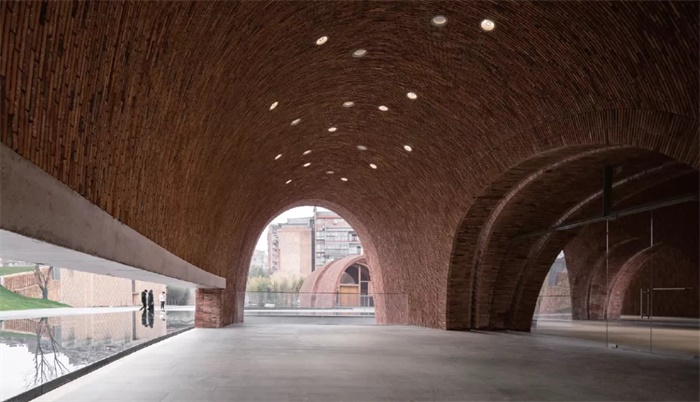 由于此处为历史街区,建筑的限高9 m,因此,设计最初考虑的即是建筑的尺度和体量。8个尺度各异的砖拱(从地平到拱顶高5 m~7 m,宽6 m~8 m不等)若即若离,以谦逊的态度和恰当的尺度植入复杂的地段之中。建筑的各个拱体并非平行垂直的关系,微微的角度变化也强化了空间的视觉张力。这样,建筑就被刻画得好像人的目光可以随意变换水平方位进行纵深观看一样。这或许是朱锫从中国绘画中获得的教益——中国的绘画从未发展出以数学为基础的直线透视法,它的透视法的立足点是游移变化的,并不存在单一的消失点。这样,建筑师处理着各种微妙的关系,一个看似随心肆意的设计却极具针对性。