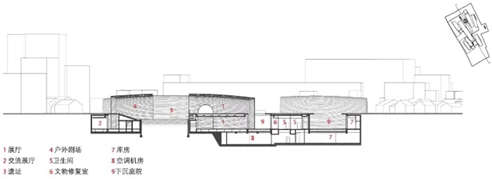 从御窑博物馆的长梯展厅南望,一座尺度适宜、灵巧疏散的庭院成为游人的视觉焦点,也是室内空间的自然延伸,并引出通往修复区域的路径。实际上,御窑博物馆塑造了很多空的拱体,它们并不是纯室内,而是处于半户外,一方面为人们提供了遮阳避雨的空间;另一方面,端头末尾的灰空间模糊了建筑与周边环境的界限。御窑博物馆整个设计都在协调环境内外的关系,给人造成的是不断在内外之间游走的经验。例如,位于博物馆入口右侧地下的袖珍庭院故意高出地坪,这处庭院是作为博物馆多功能厅的一部分而存在的,似乎对于厅内的人来说,这一庭院才是真正的风景——在逼仄的院落里,自然像盆景一样浓缩成两株石榴、一片天空。朱锫在御窑博物馆多处采用此手法,将有着严格功能要求的封闭房间向外打开,建立室内外的视觉关联。