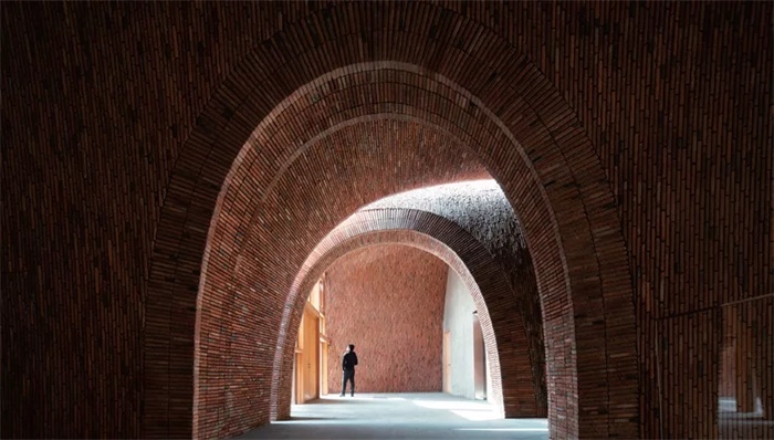 在建筑的材料和结构方面,受到徐家窑的启发,御窑博物馆采取的拱的形态并不是笔直的筒拱,而是两端有收拢,略显纺锤形的一种优雅美观形态,同时体现了建筑师朱锫的造物驾驭和支配能力。对于建筑的结构而言,每个建筑拱体的结构近似三明治,内外两层砖中间为钢筋混凝土,夹在中间的混凝土拱为主体结构,以抵御地震时的侧推力,外部采用新老窑砖混合砌筑。在现代主义的语境下,这种三明治结构似乎违背了“砖想成为拱”的金科玉律,笔者以为这种看法是把材料与结构的认知教条化了。