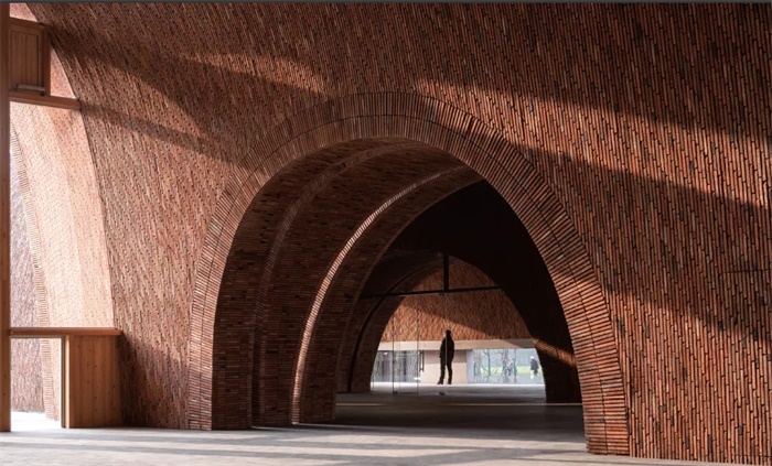 据史料记载,古罗马人很早就开始采用混凝土进行建造,混凝土可以浇铸塑形,当被塑成拱、穹顶等形式之后可以产生大的空间跨度。罗马人运用这项技术建造了筒形拱。在混凝土建造时为了防止混凝土与木模板的粘连,当地人用两层砖表皮当作混凝土的模板并在其中灌入混凝土。人们已经接受了砖拱的优雅外形,因此在做混凝土模板的时候把砖拼成了圆拱,但实际上是粘贴在混凝土结构表面的面层。路易·康(Louis Isadore Kahn)在奥斯提亚古城(Ostia Antica)看到的拱大都是以砖为皮的混凝土拱,或许是这些被符号化后的“假拱”影响了他。对于御窑博物馆的砖墙,砖的表层并非表现“砖想成为拱”的物理真实,而是建筑师旨在通过砖的表层唤起人们对景德镇砖窑时间与温度的记忆。