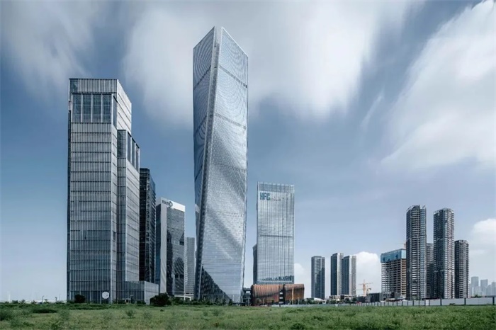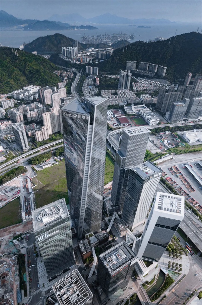 近 300 米高的前海世茂大厦,是深圳前海地区的地标,也是世界上最高的结构扭转建筑之一,它采用自下而上的收分式设计,实现外幕墙+结构外框柱同时扭转的形态。
