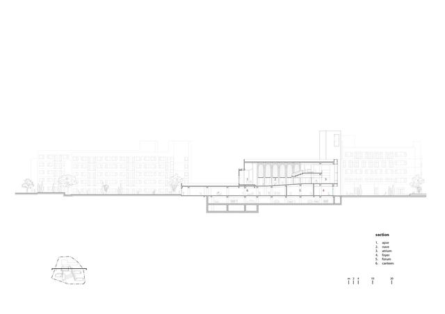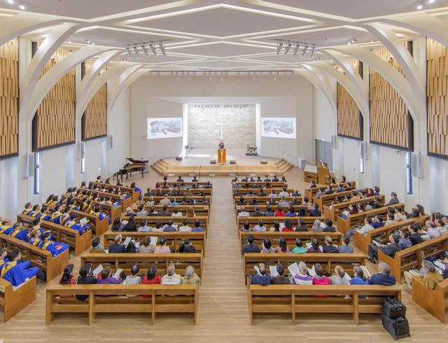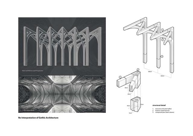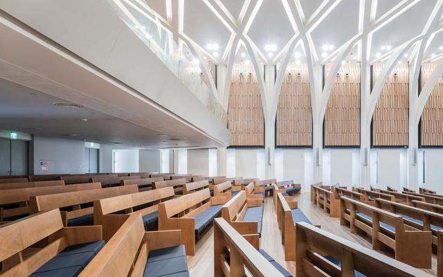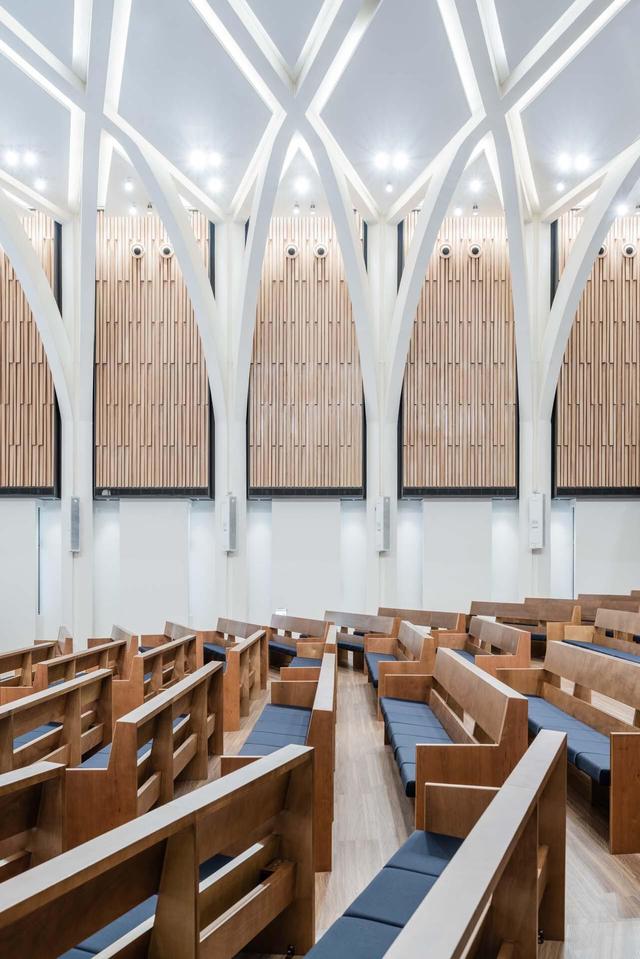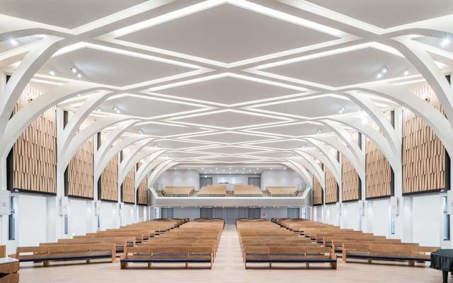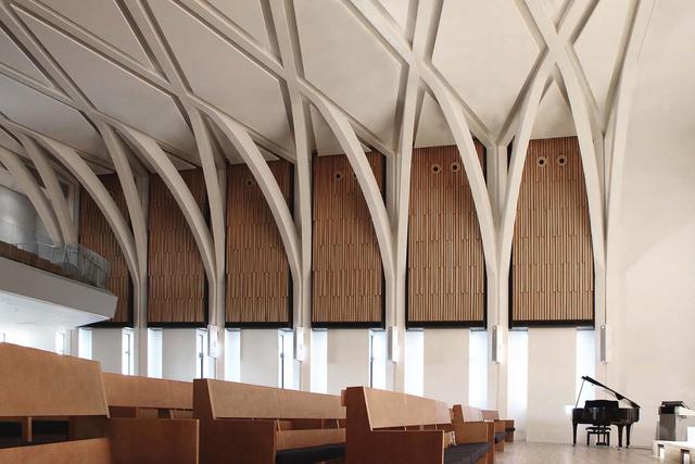 大跨距的无柱空间是以哥德式教堂拱顶结构为概念,转化以现代钢结构表现,并整合天花与灯光设计,重新诠释哥德式建筑中的肋状拱顶,塑造学院特有之礼拜空间。