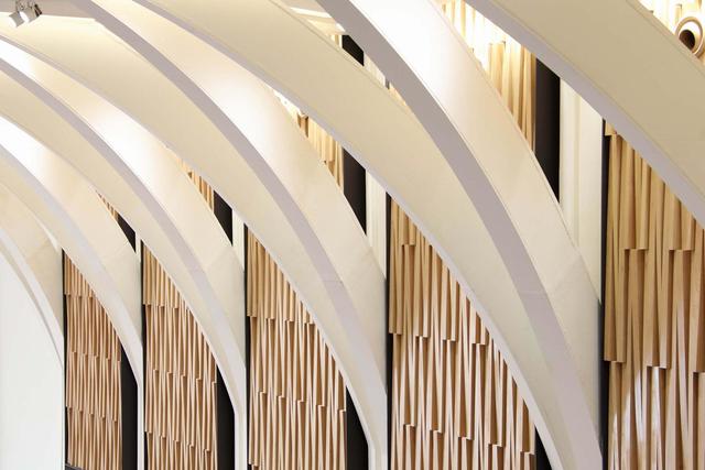 两侧以云杉木条镶崁而成之扩散墙面,满足礼拜堂声学所需,亦兼具空调系统功能。