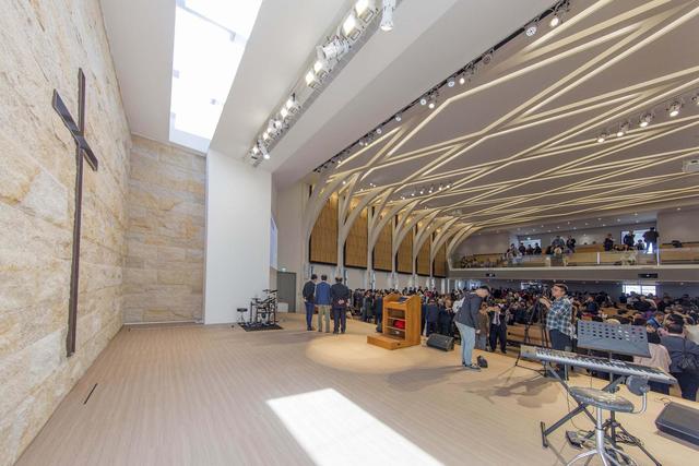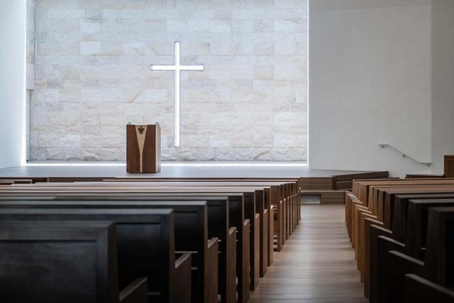 上部天窗设计,全天候漫射光线照亮讲台,与大堂间形成明暗对比,主墙明亮的十字架投射于空间深处,教堂内氛围更显宁静安祥,尽领与神同在的真实平安。
