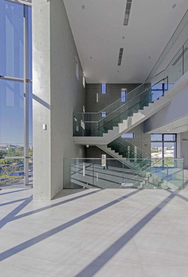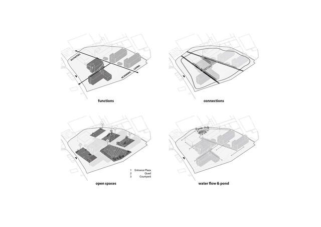 项目按照使用需求,规划有文教大楼、礼堂大楼、师生宿舍等四栋建筑物;半开放式的风雨走廊互相串联轴线上各栋建物,与校园环场步道连通,建构完整便捷之研究及生活环境。